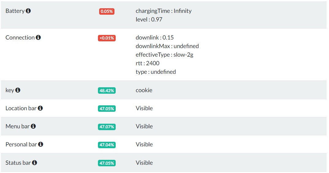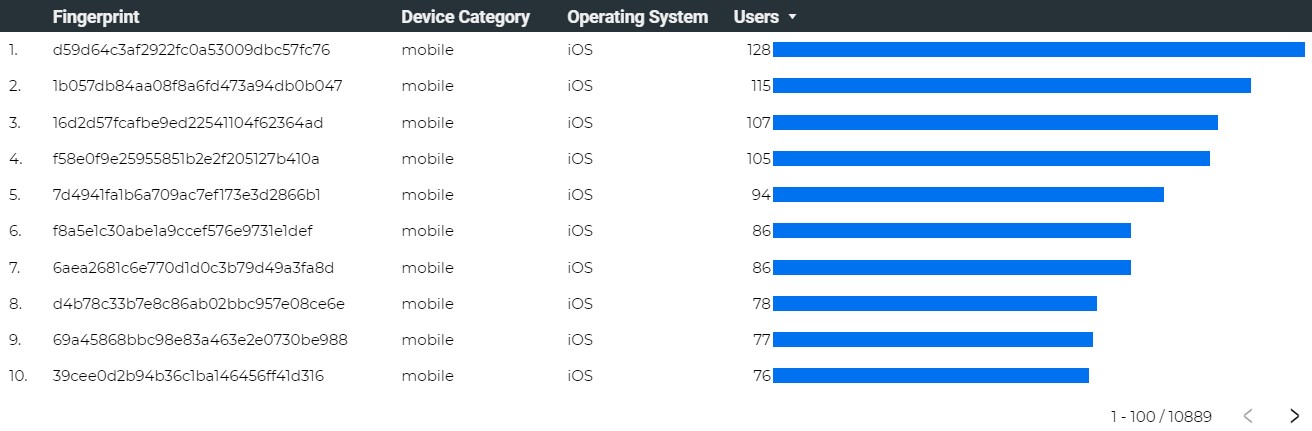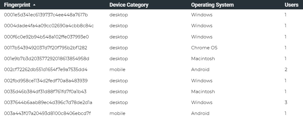 Herunder ses nogle eksempler på fingerprints, device, browser samt hvor mange GA users der har præcis denne kombination. Hvis et fingerprint skal være unikt, skal det kun matche én bestemt User. Ellers er der dermed flere browsere som har det samme fingerprint og så kan det ikke bruges til at genkende én browser mellem sidevisninger og besøg, som en cookie kan.