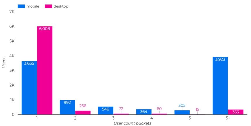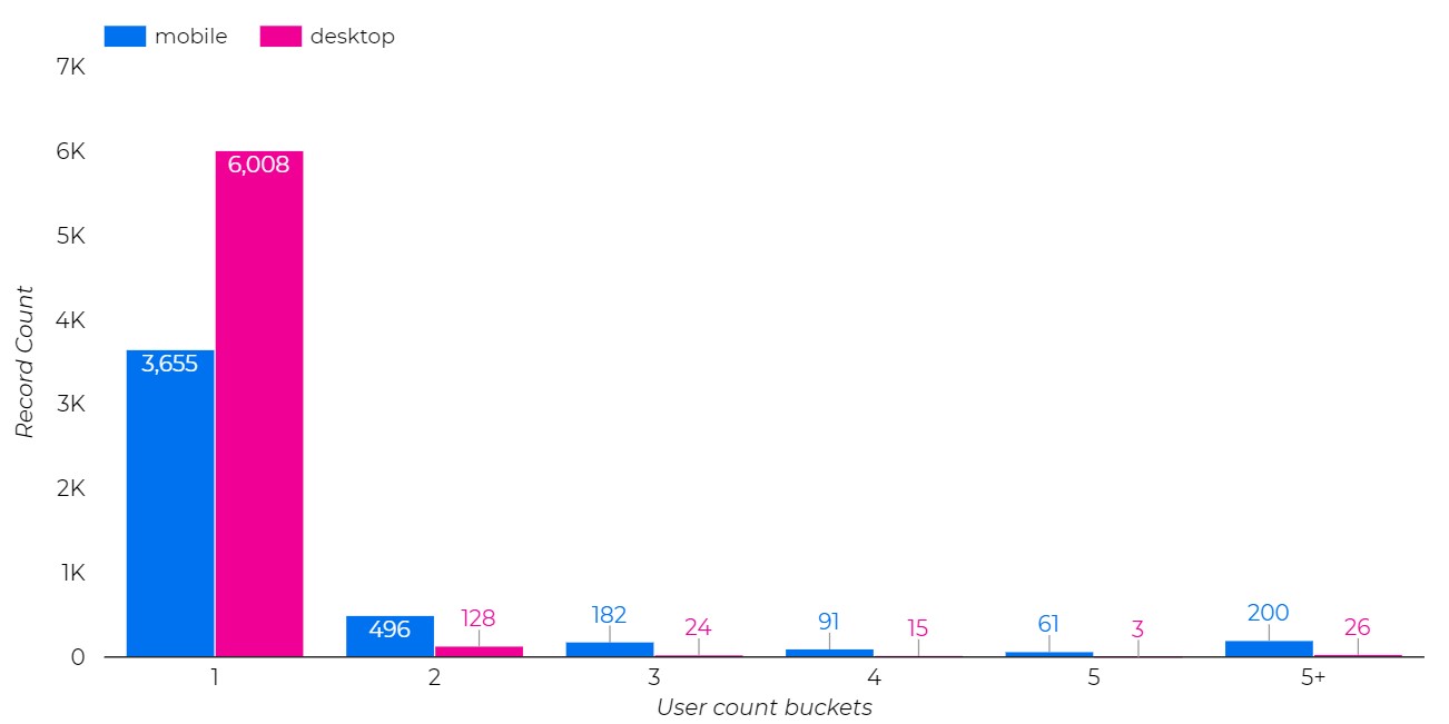 Hvis vi kigger på hele datasættet opdelt i desktop og mobile er der dog en stor andel af fingerprint værdierne der kun har én GA user, så de er unikke.