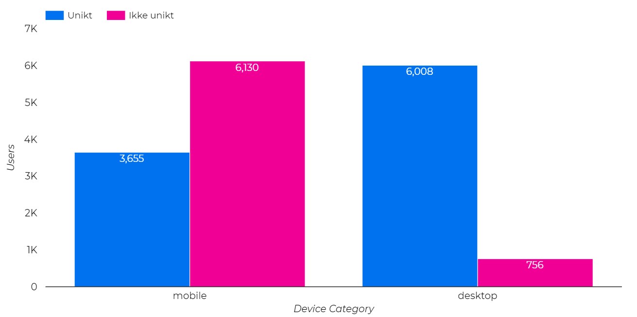 Langt størstedelen af desktop har kun én User, men der er stadig 26 fingerprints som er fælles for mere end 5 GA Users. På mobile ser det dog anderledes ud, hvor der stadig er flest som matcher én User, men der er mange som matcher mere end én.