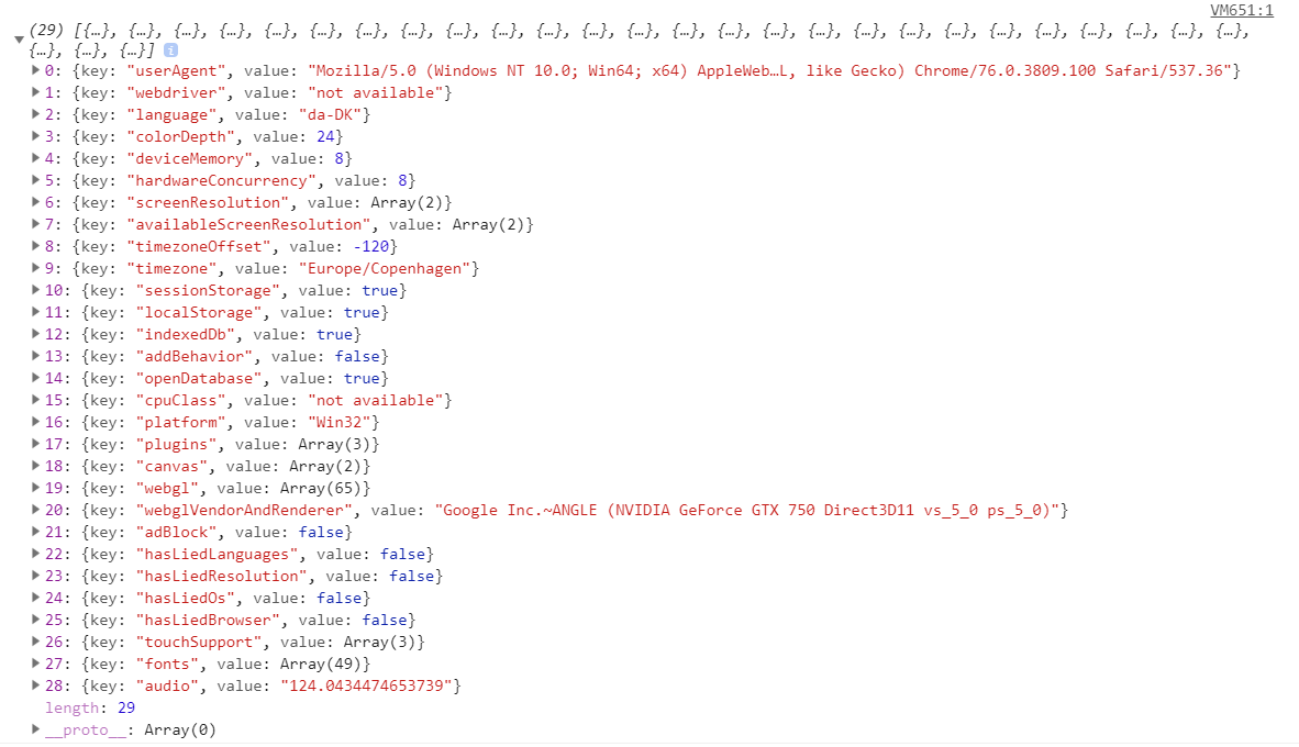 Fingerprintjs laver et Array med alle datapunkterne som derefter hashes så man får en værdi som fx 69a45868bbc98e83a463e2e0730be988.