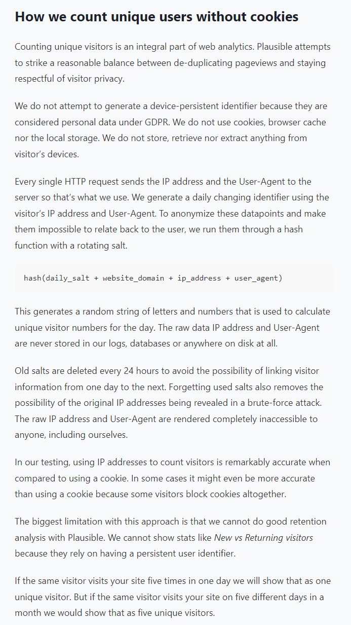I stedet for cookies bruger laver de et hash af IP adresse og User Agent samt et daily salt. Derved kan de genkende den samme bruger på den samme dag, men næste dag vil der være et nyt salt og så vil brugere være en ny unik bruger. Teoretisk vil der sagtens kunne være flere forskellige brugere fra den samme IP som har samme User Agent, men i praksis vil det være marginalt, så det er et OK kompromis. Meget bedre end fingerprinting, som faktisk ikke bruger IP adressen.