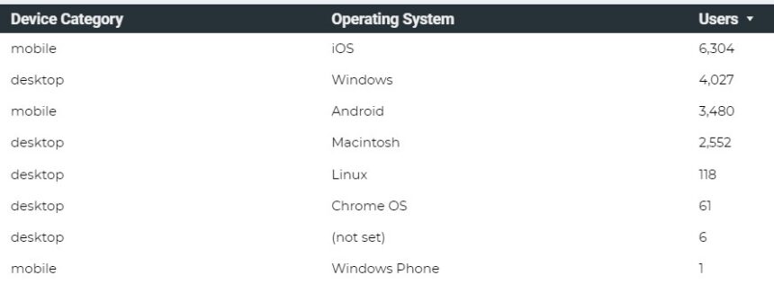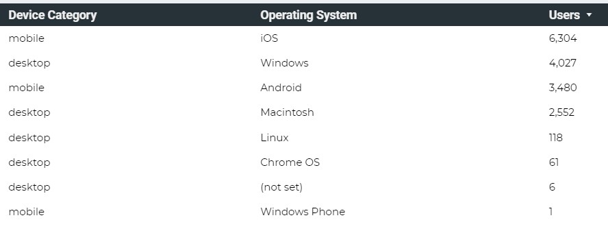 Herunder ses antal users i datasættet fordelt på Device Category og Operating System. Der er 6304 users på iPhone og iPad, så når der er 128 brugere med samme fingerprint, så er det 2% af alle iPhones/iPads der har identisk fingerprint. Ikke særlig unikt, må man sige.
