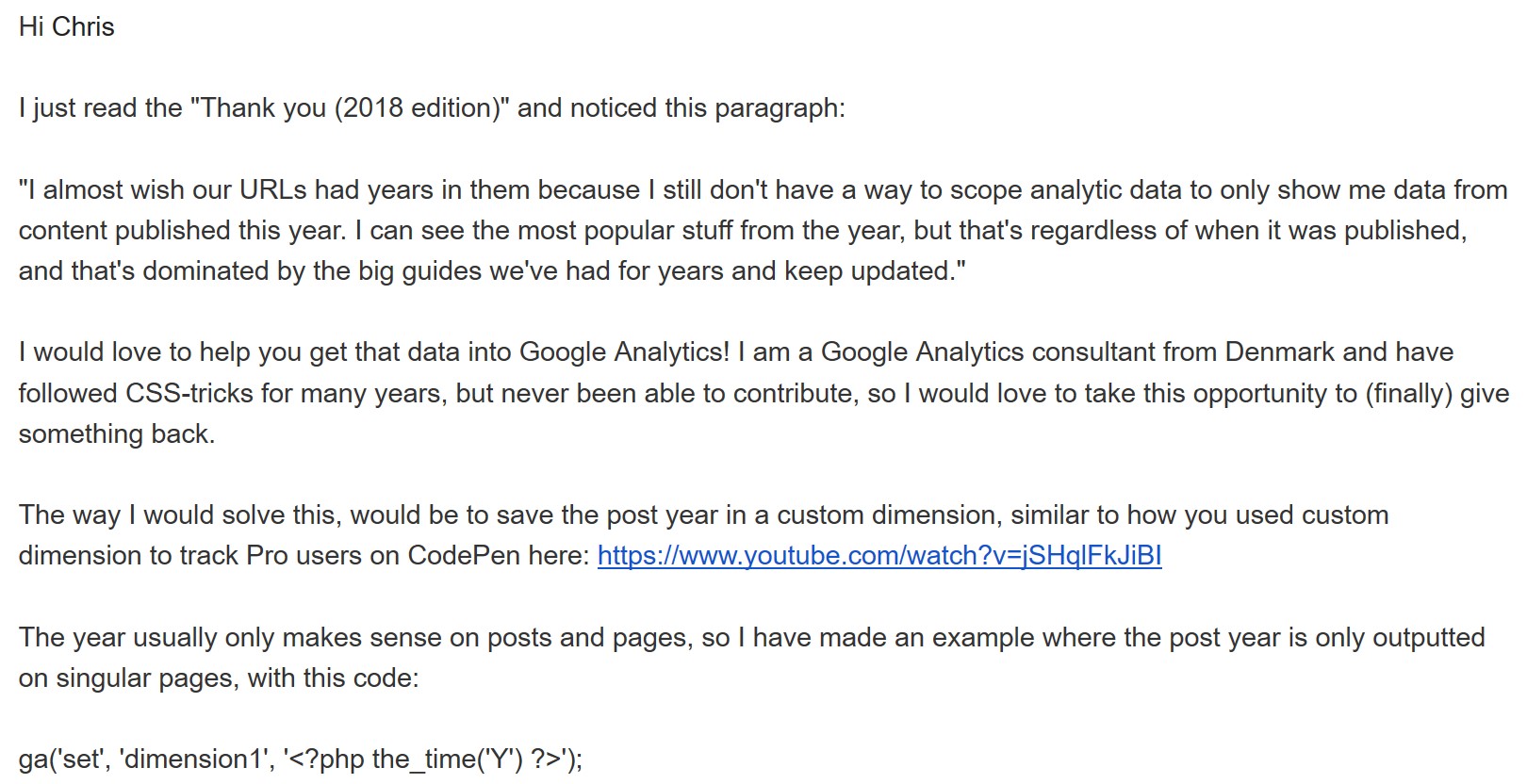 Jeg skrev en hurtig mail til Chris og fortalte at jeg var ekspert i Google Analytics samt en lille guide til at tracke året i en custom dimension. Jeg respekterede hans tid og lavede derfor alt koden så det var nemt for ham at copy/paste ind på sitet.