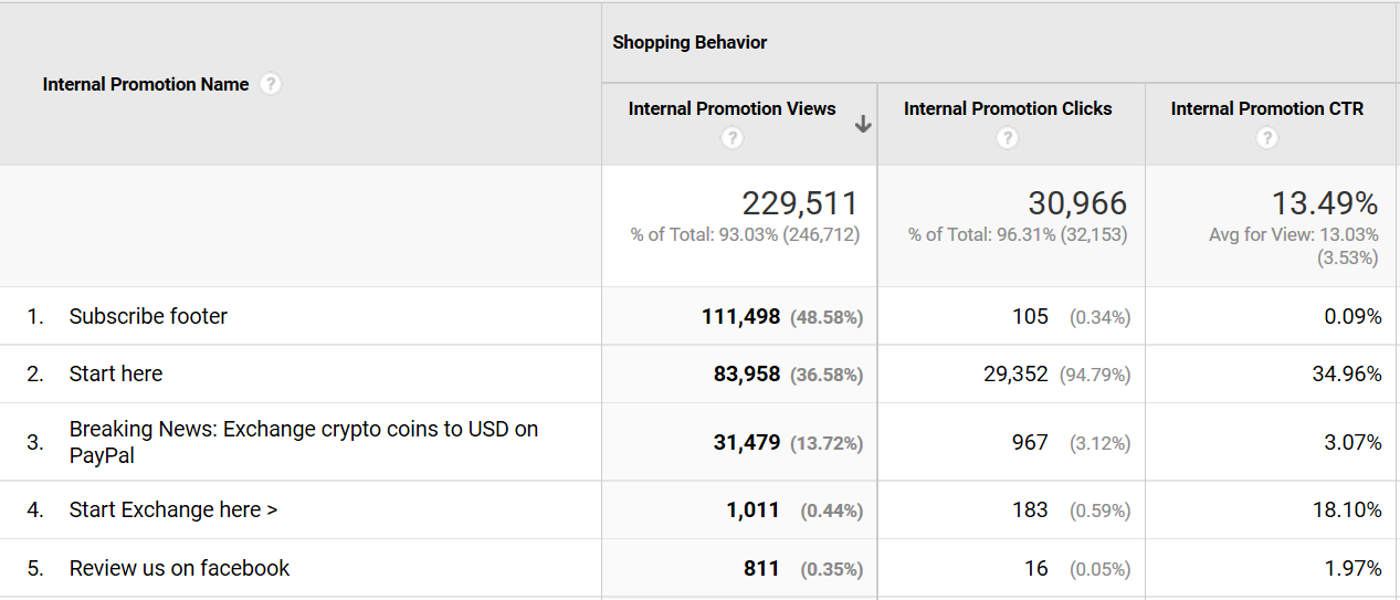 Breaking News var en nyheds-ribbon vi havde på forsiden med et tekstlink som linkede videre. Den har en CTR på 3% og dermed slet ikke samme CTR som vores CTA-knapper. “Start Exchange here >” er fx en CTA-knap på en landingpage og har en CTR på 18%. Igen er det ikke overraskende at knapper er bedre end tekstlinks, men det er bare så fedt at få noget data på det!