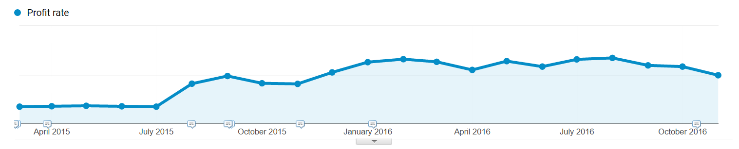 Dermed kan vi nemt få et overblik over hvordan vores avanceprocent udvikler sig over tid. Og ved at have det i Google Analytics, kan vi nemt segmentere det på trafikkilde, landingpages, etc.