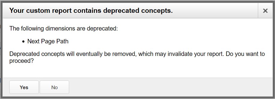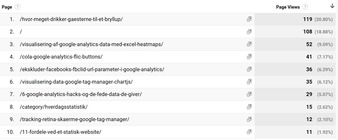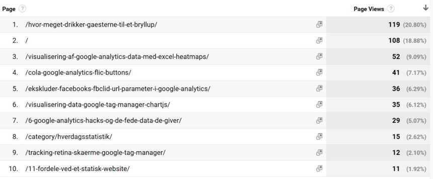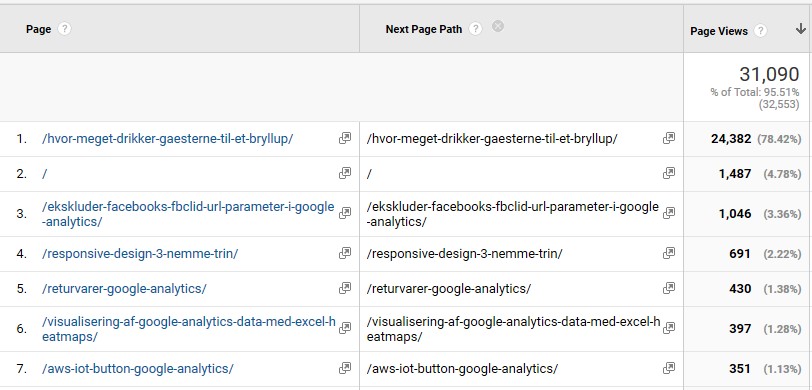 Det skyldes at et givent hit eller pageview i Google Analytics, isoleret set, ikke har informationer om hvad der sker efterfølgende. Man kan derfor ikke vælge forsiden i “All pages”-rapporten og derefter se hvad brugerne gør derefter med Next Page Path dimensionen. Den indeholder nemlig præcis det samme som Page dimensionen.
