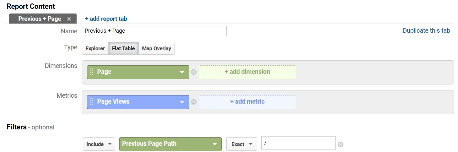 Tricket til at se den næste side efter forsiden er derfor at lave en rapport som kigger på alle sider og filtrere så du kun ser de sider hvor den forrige side er forsiden. Det kan nemt laves i en custom report sådan her: