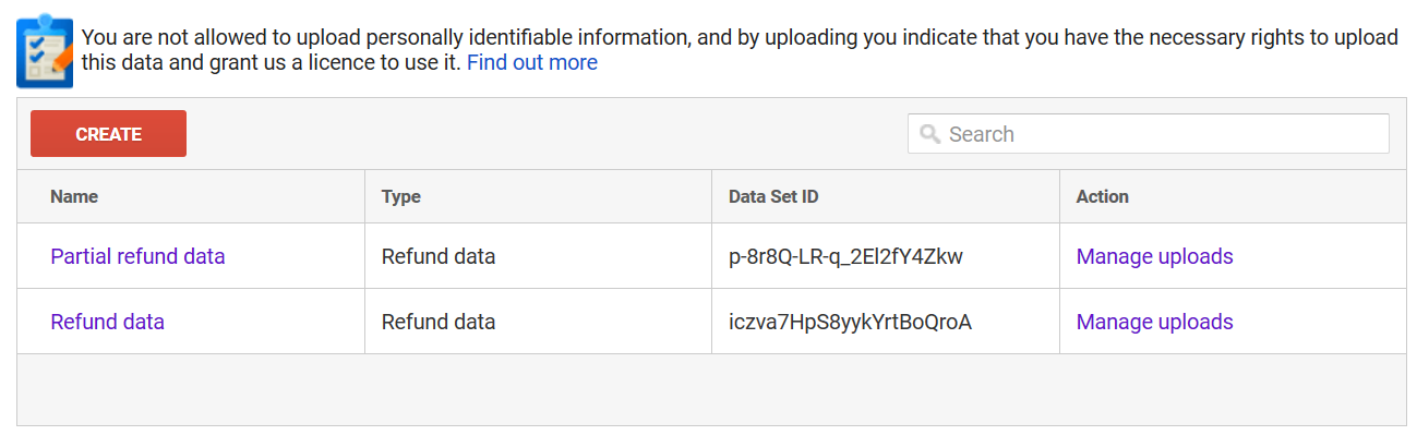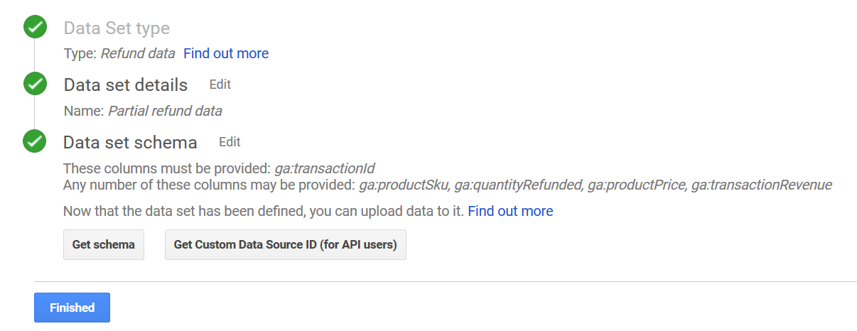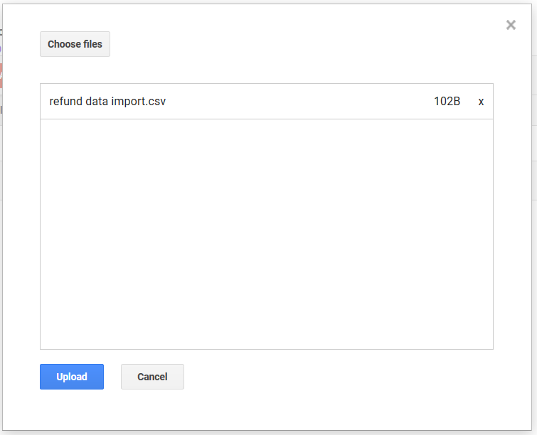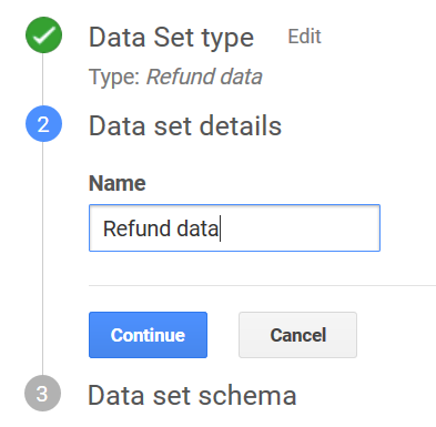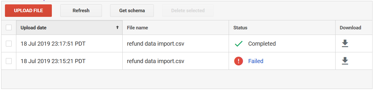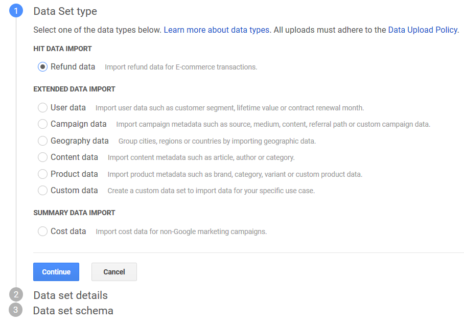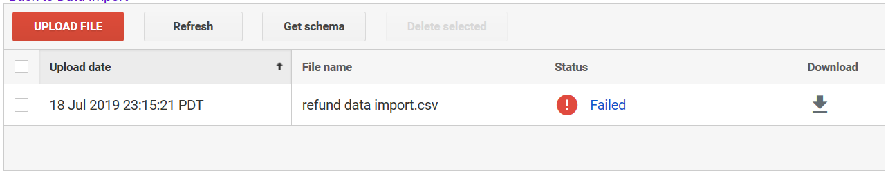 Hvis du kun har ganske få returneringer, kan det måske ikke betale sig at kode en automatisk løsning til det. I det tilfælde kan du også uploade en CSV fil med de ordre ID’er der er returneret via data import inde i Google Analytics interfacet.