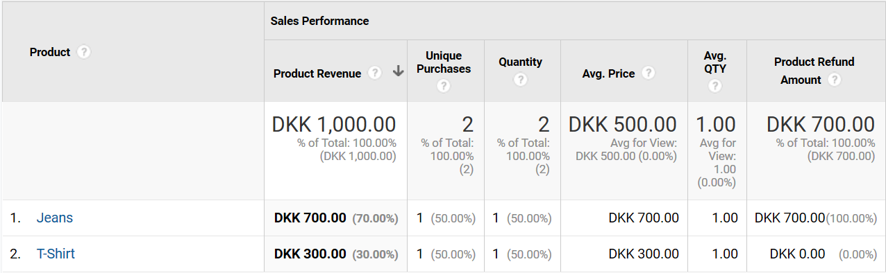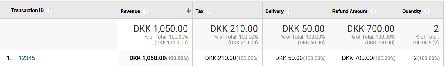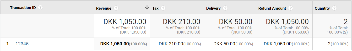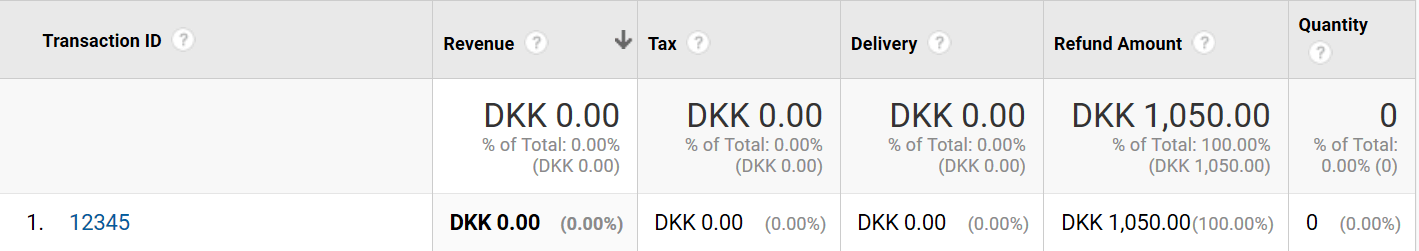Det der istedet sker er at der bliver registreret en returnering af den ordre, hvor Google Analytics bruger det ordrenummer der er sendt med i ovenstående Refundaction til at finde alle informationerne om ordren og registerer en returnering med dem.