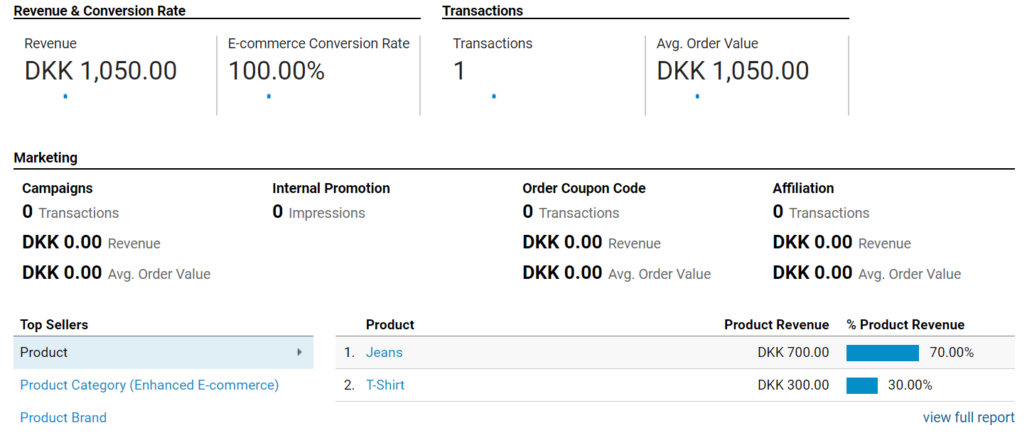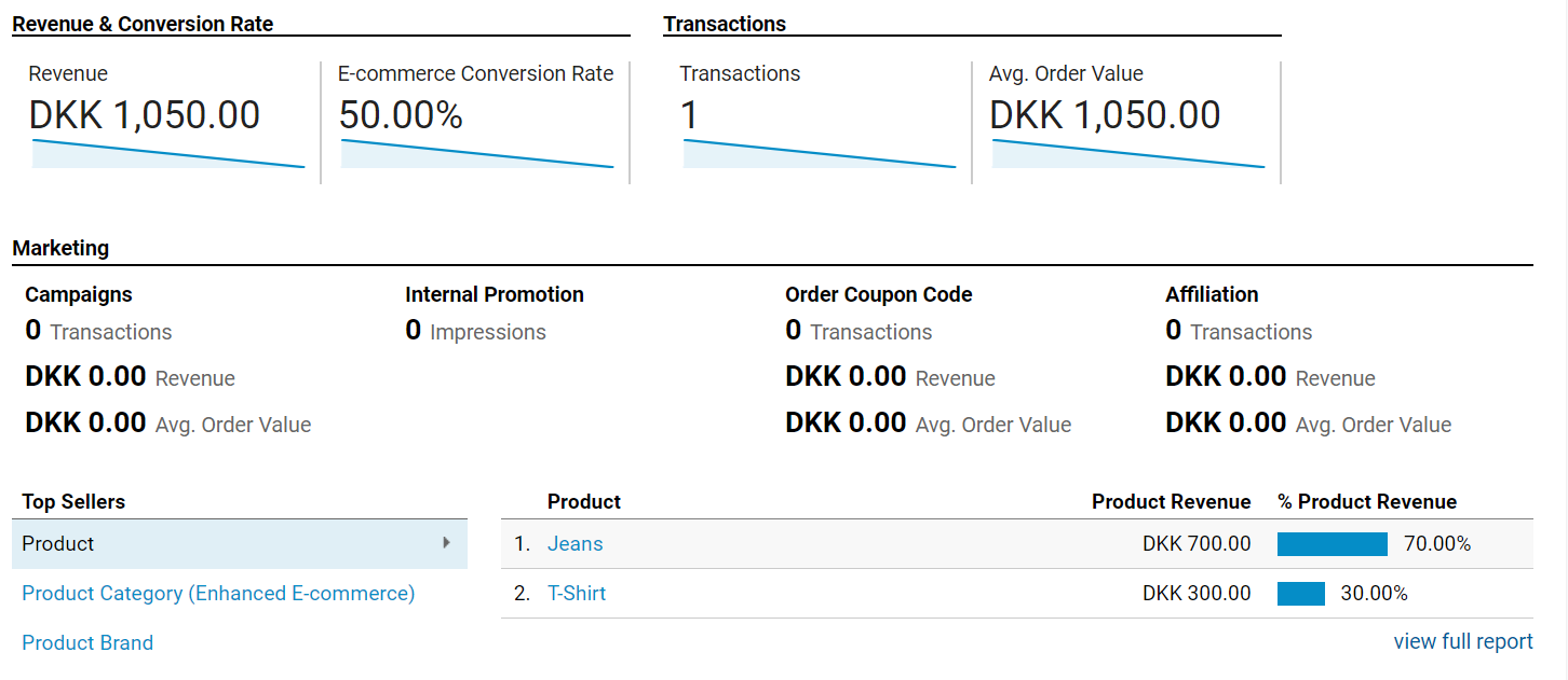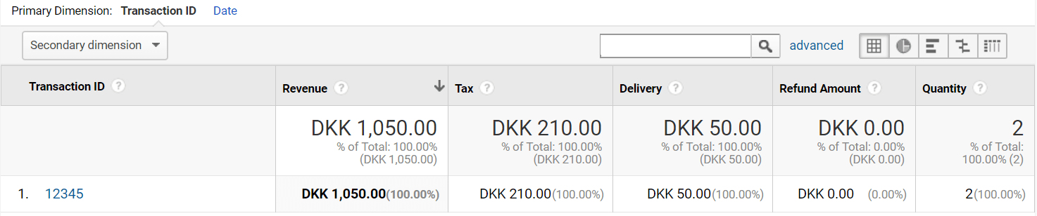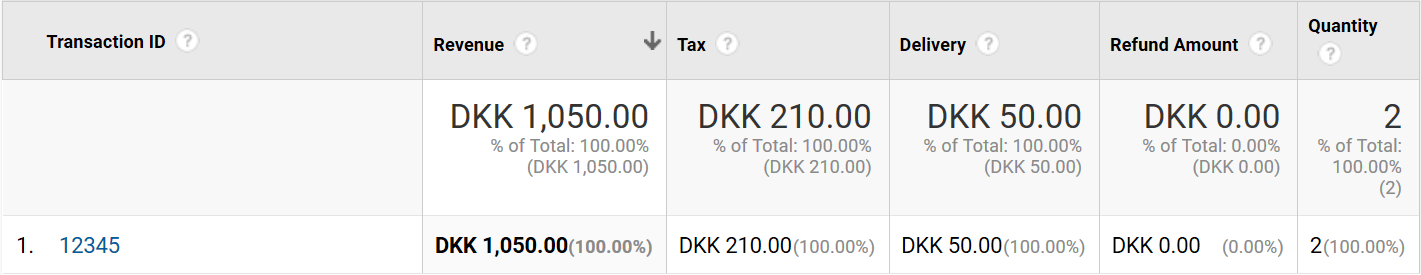 Bemærk! Hvis der er flere ordre med samme transaktions ID, så vil Google Analytics tage beløbet og produkterne fra den seneste ordre.
