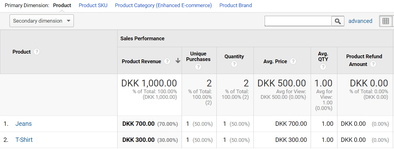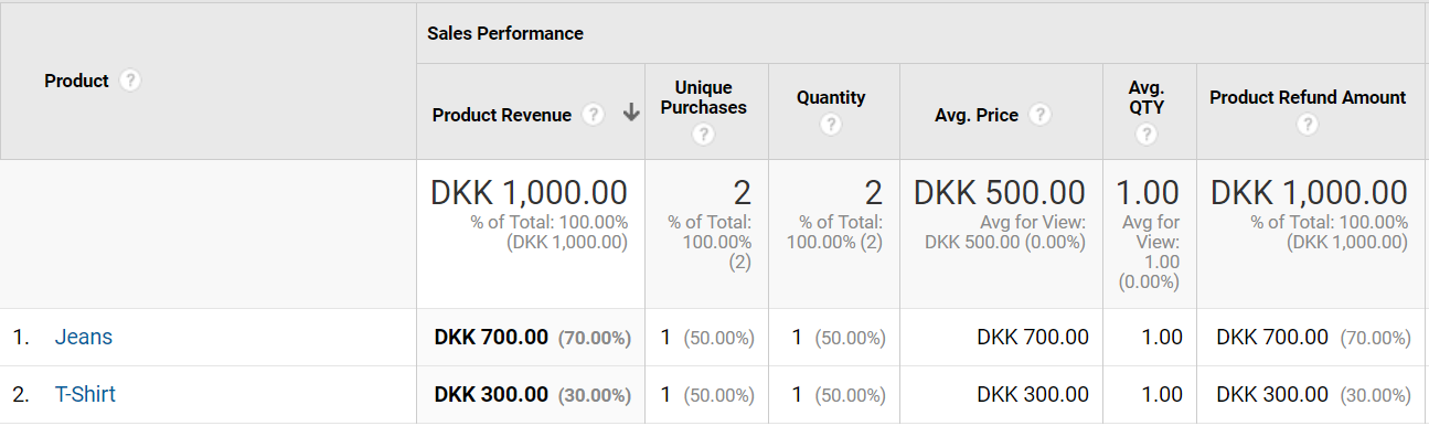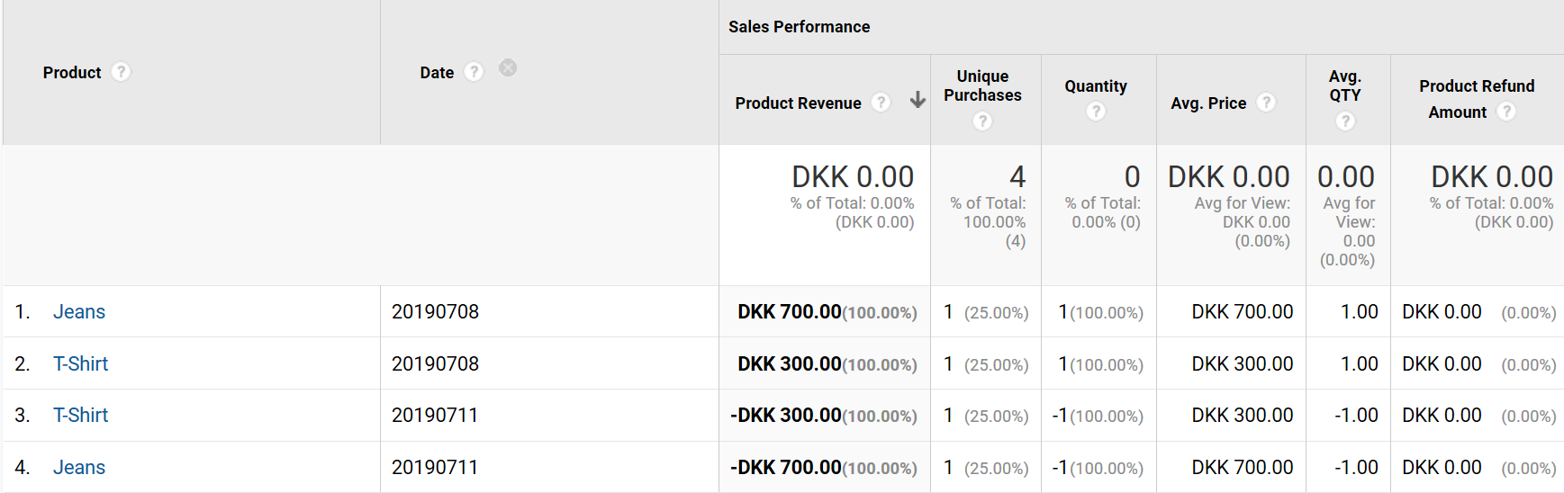 Bemærk at Product Revenue bliver negativ, når mængden er negativ. Resultatet af de to ordre tilsammen ses i øverste linje hvor den totale Product Revenue er 0,00 og den totale købte mængde er 0.