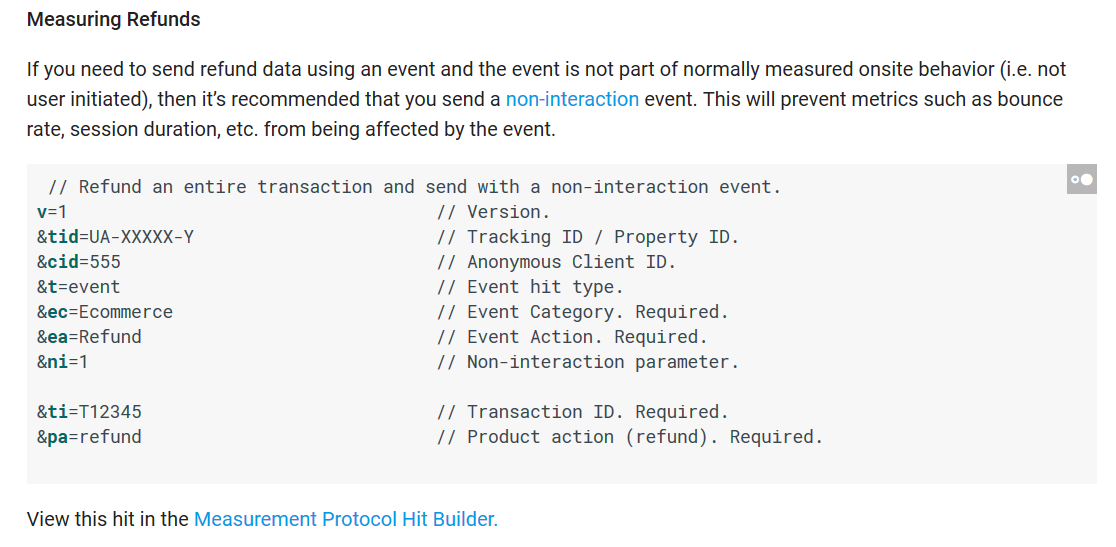 Dokumentationen for Google Analytics Measurement Protocol indeholder en masse gode eksempler, herunder Refunds.