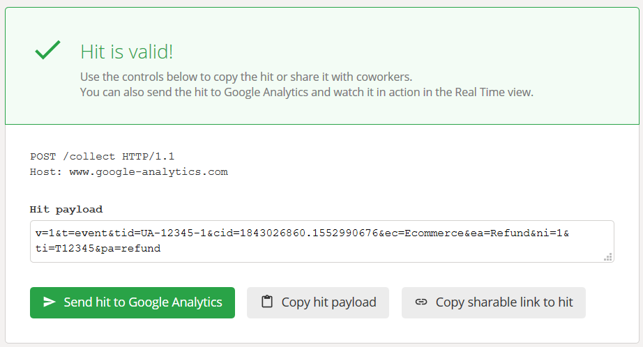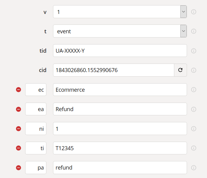 https://www.google-analytics.com/collect?v=1&t=event&tid=UA-12345-1&cid=1843026860.1552990676&ec=Ecommerce&ea=Refund&ni=1&ti=T12345&pa=refund