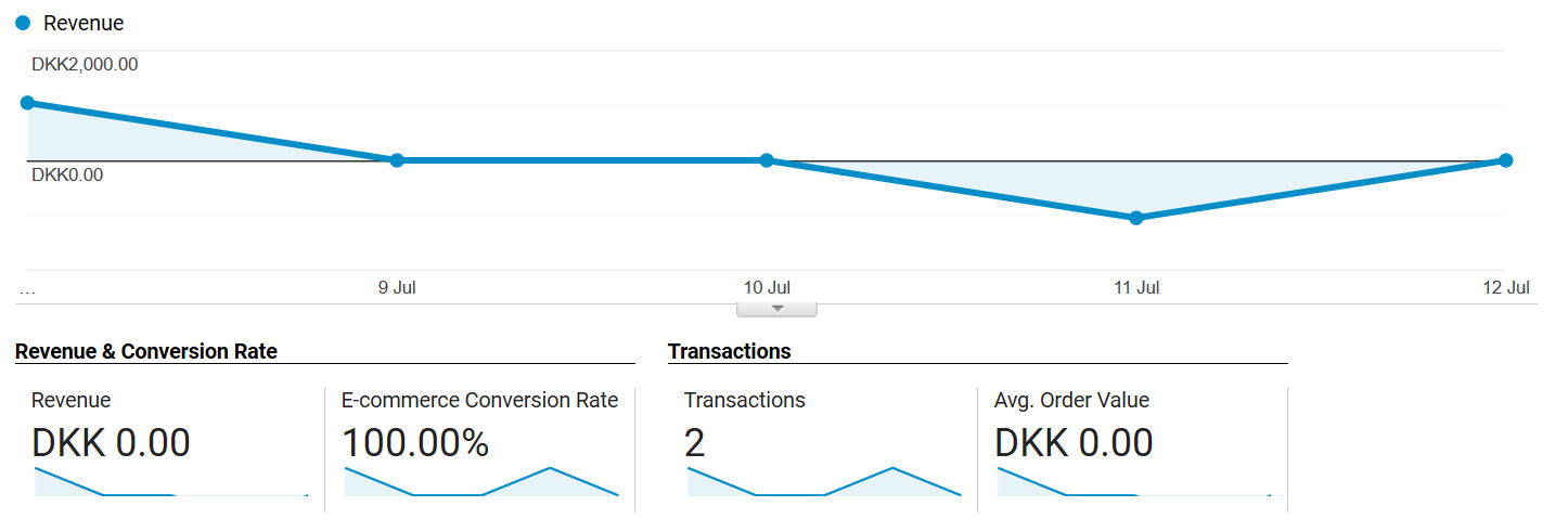 Omsætningen er også uændret i dit E-commerce overview, både for ordren og produkterne. Det samme gælder alle andre steder i Google Analytics rapporter, hvor du kigger på omsætningen, fx trafikkilder og landingpages.