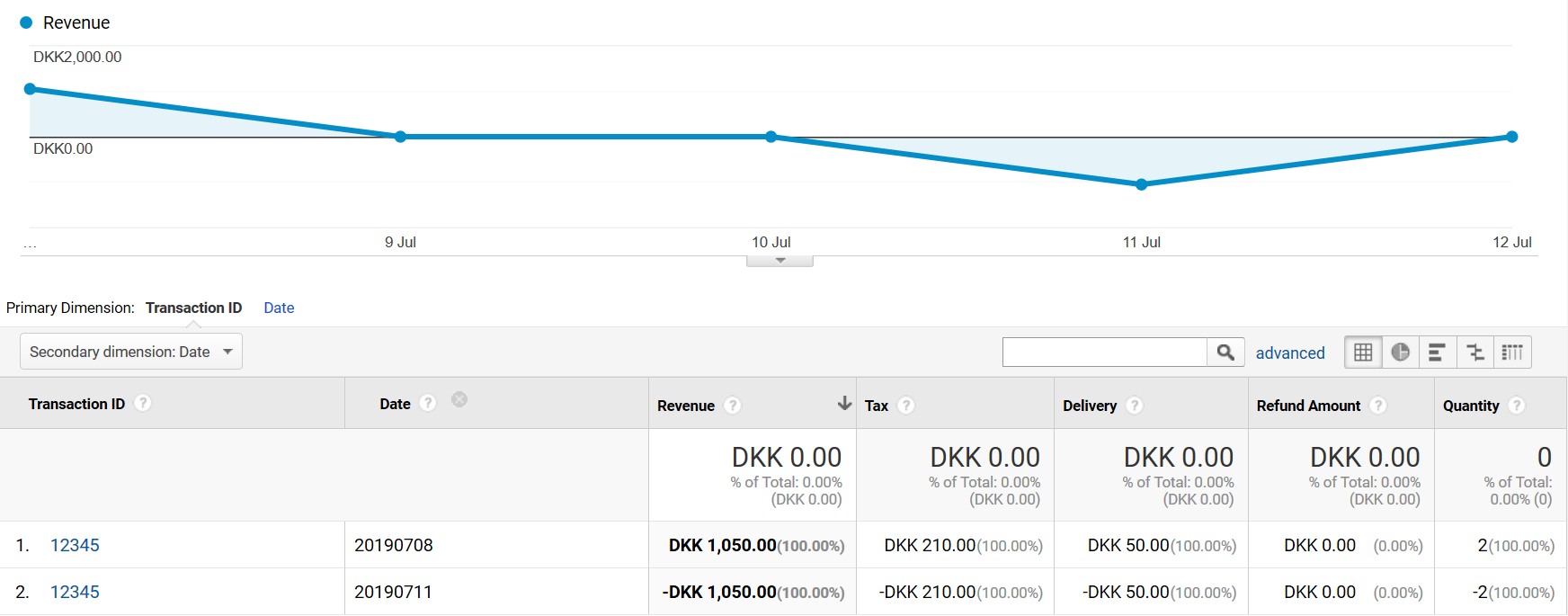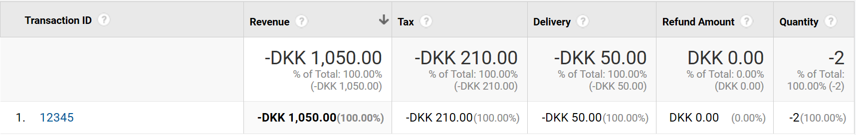 Ordren med negativ omsætning ser sådan ud i Google Analytics - bemærk negativ omsætning og negativ mængde: