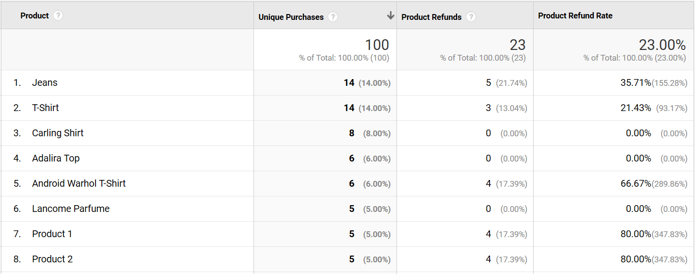 Med den kan du både sortere på Product Refunds for at finde de produkter der er returneret mest, samt sortere på Refund Rate for at se hvilke produkter der oftest bliver sendt retur i forhold til hvor tit de bliver købt.