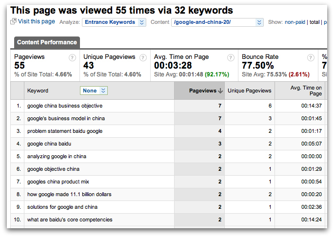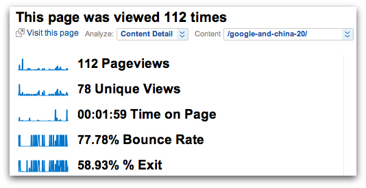Den 4. juni 2010 lagde jeg en engelsk artikel online for at se hvor meget trafik sådan en størrelse trækker. Det var for mig interessant at se fordi den for det første var skrevet på engelsk og for det andet omhandlede en højaktuel sag, nemlig den om Google og Kina. Nu er der gået 5 måneder og det er på tide at kigge lidt på hvordan det er gået. Artiklen var på 3613 ord eller det som fylder 14 sider i Word. 3613 ord er jo kun en dags arbejde for nogen, men dog en længere artikel i forhold til mange blog-posts.