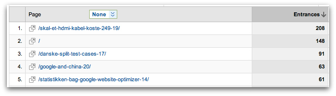 Lad os kigge lidt på hvilke søgninger den har trukket trafik på. Under “analyze” vælges “Entrance keywords” og man får nu en liste over hvilke søgeord præcis denne side har fået trafik på.
